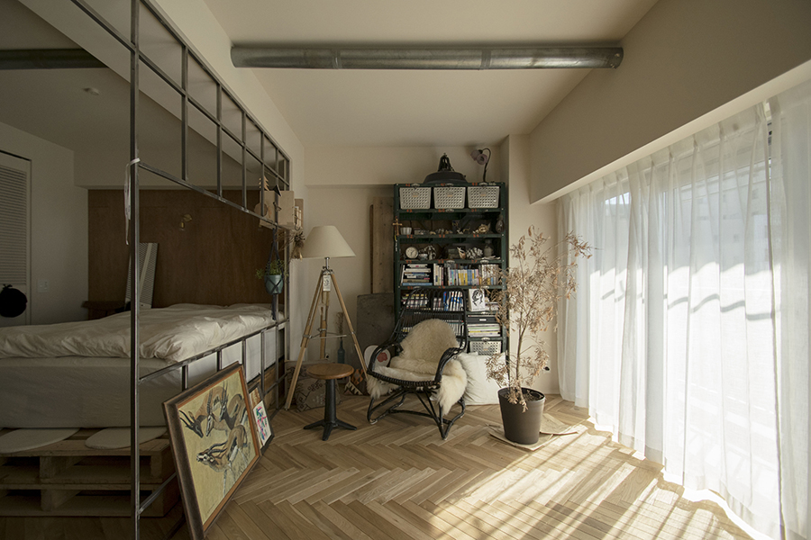 目利き不動産のオンラインメディア「cowcamo」の編集長で、純喫茶やアメリカンダイナーが好きというI様の職住近接のご自宅。リノベーション住宅のプロである施主の感性を共有して要望を実現することを前提に、こだわりのアンティークインテリア群と器(箱)が対立しないように、ディテールを抽象化した空間に。
